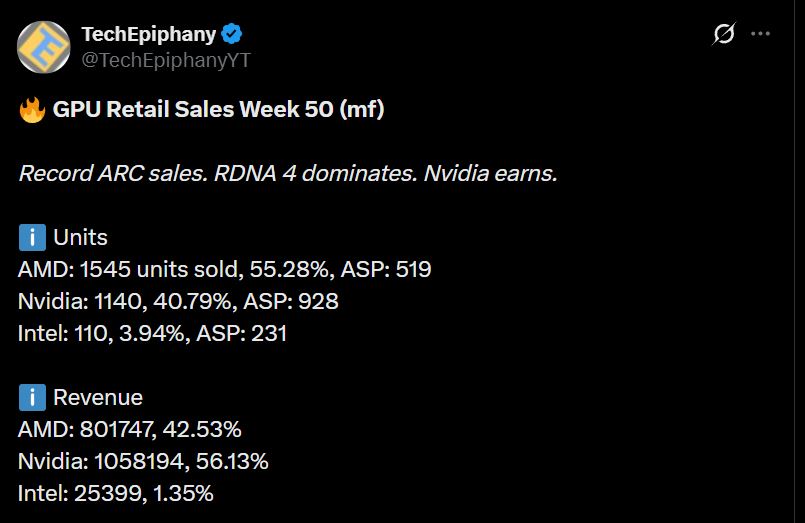 Intel’s entry-level Arc A310 has also seen respectable sales with 30 units last week. Although Arc B series’ sales figures don’t yet match expectations, they are starting to gain traction due to their 12 GB/10 GB VRAM and competitive pricing. Intel’s revenue share has now surpassed 1%, while NVIDIA and AMD hold 56.13% and 42.53%, respectively. Despite AMD selling 1545 units versus NVIDIA’s 1140, Intel’s overall sales exceeded 100 units, with an average selling price of 231 Euros.