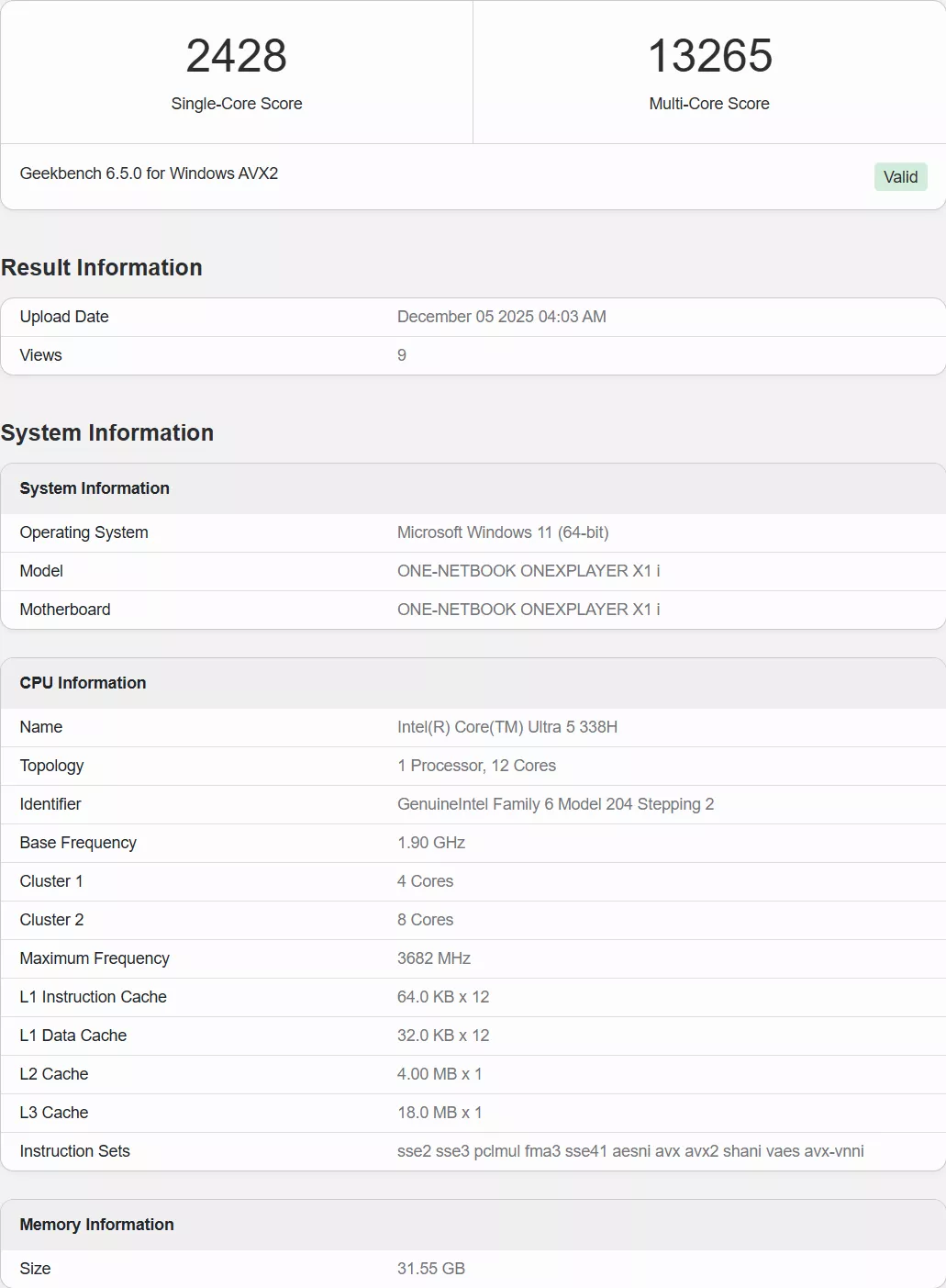 The first glimpse of a Panther Lake handheld device has also been leaked on Geekbench. This device, the OneXPlayer X1 i, is equipped with the Intel Core Ultra 5 338H CPU, featuring 12 cores and a clock speed of up to 4.6 GHz.