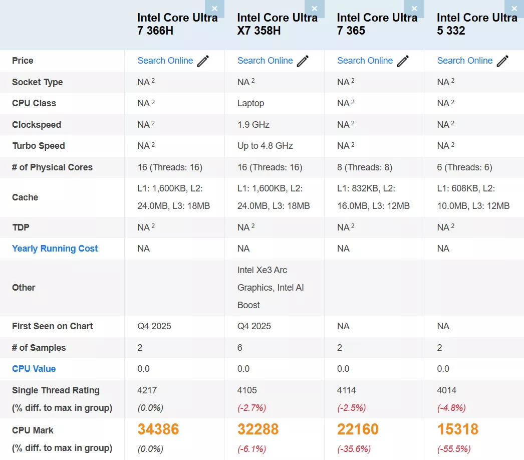 Four Intel Panther Lake “Core Ultra Series 3” CPUs have been revealed through the PassMark benchmark suite, showcasing their capabilities. The lineup includes the Core Ultra 7 366H, Ultra X7 358H, Ultra 7 365, and Ultra 5 332, each with distinct specifications and performance attributes. The Core Ultra 7 366H offers 16 cores, 18 MB of L3 cache, and 12 MB of L2 cache. In contrast, the Core Ultra X7 358H has a similar core setup with a 4.8 GHz boost clock. Meanwhile, the Core Ultra 7 365 and Core Ultra 5 332 have 8 cores and 6 cores, respectively, with varying cache configurations.