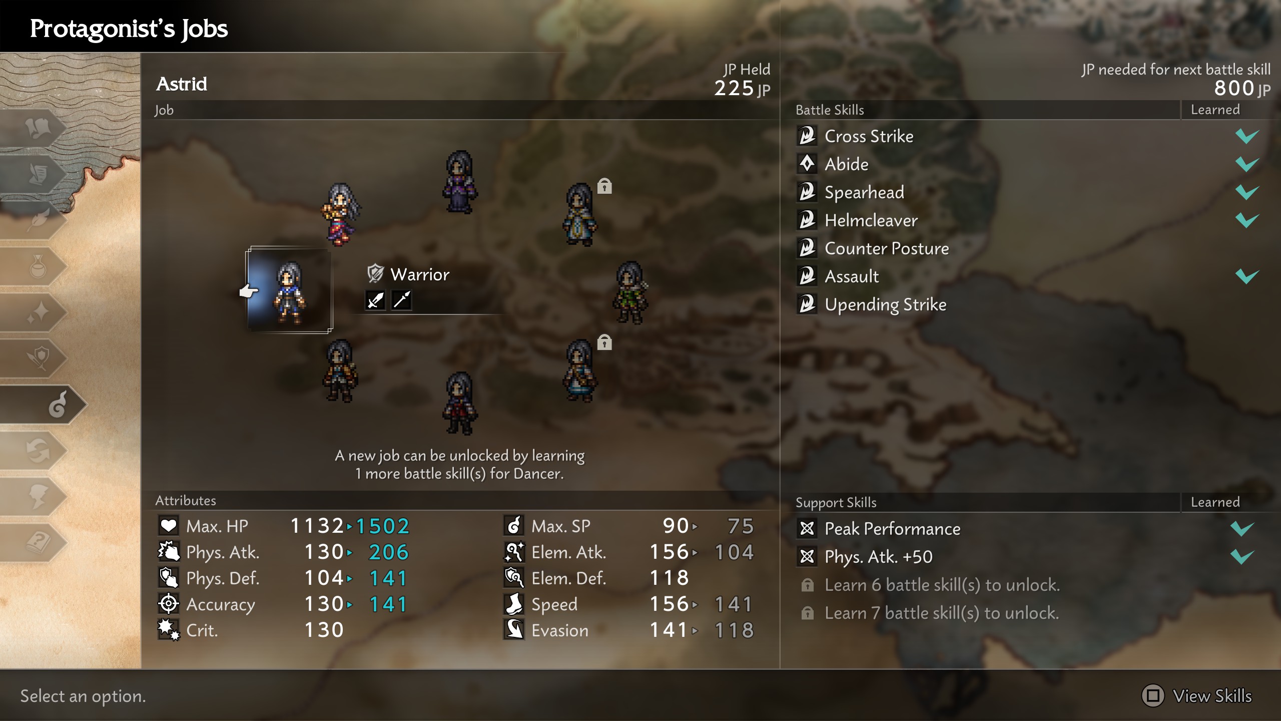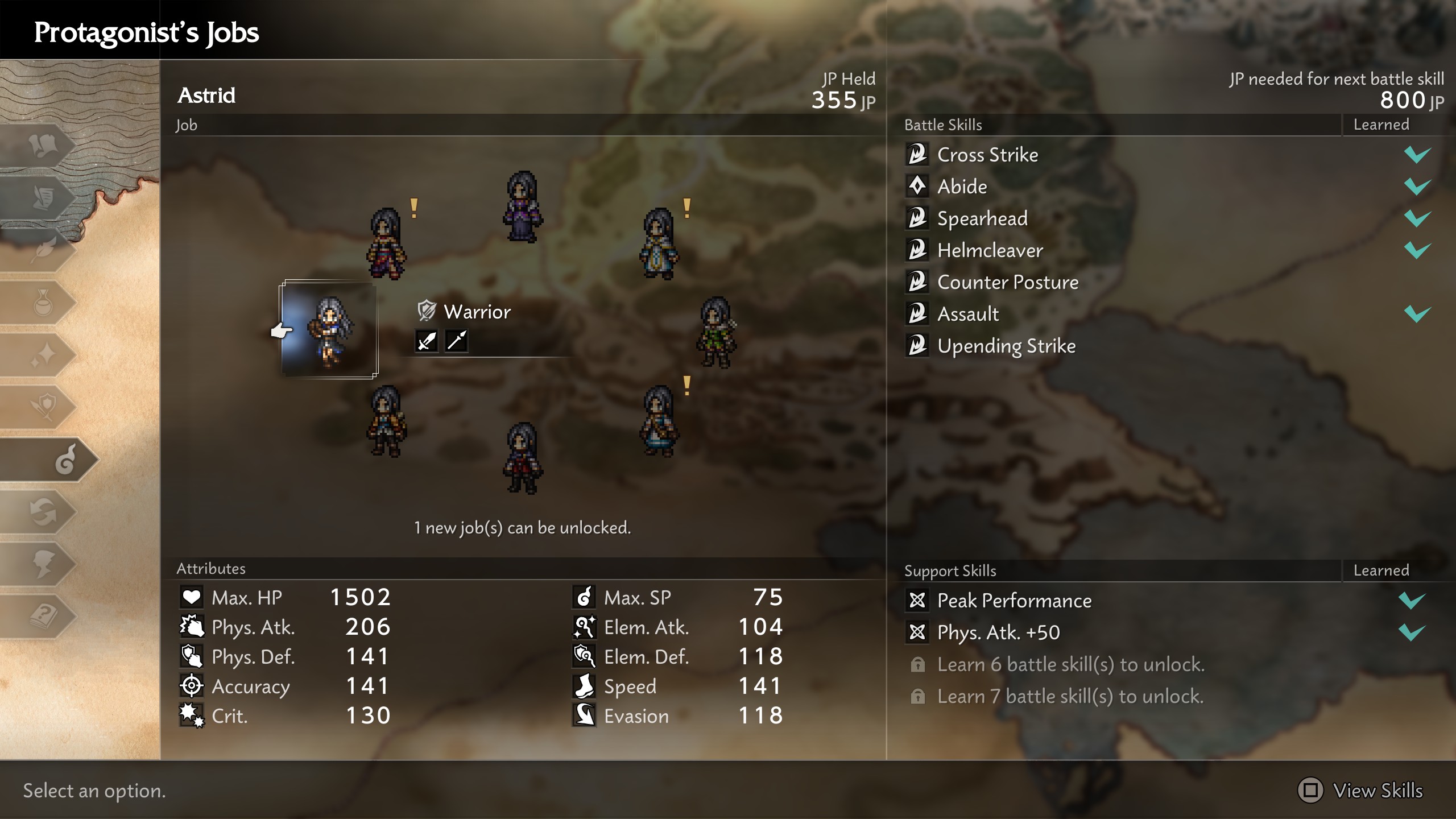 After completing the introduction, players can select a starting Job from eight possibilities. Achieving a new Job requires mastering three skills from the previous Job, costing a total of 430 JP (30 JP for the first skill, 100 for the second, 300 for the third).